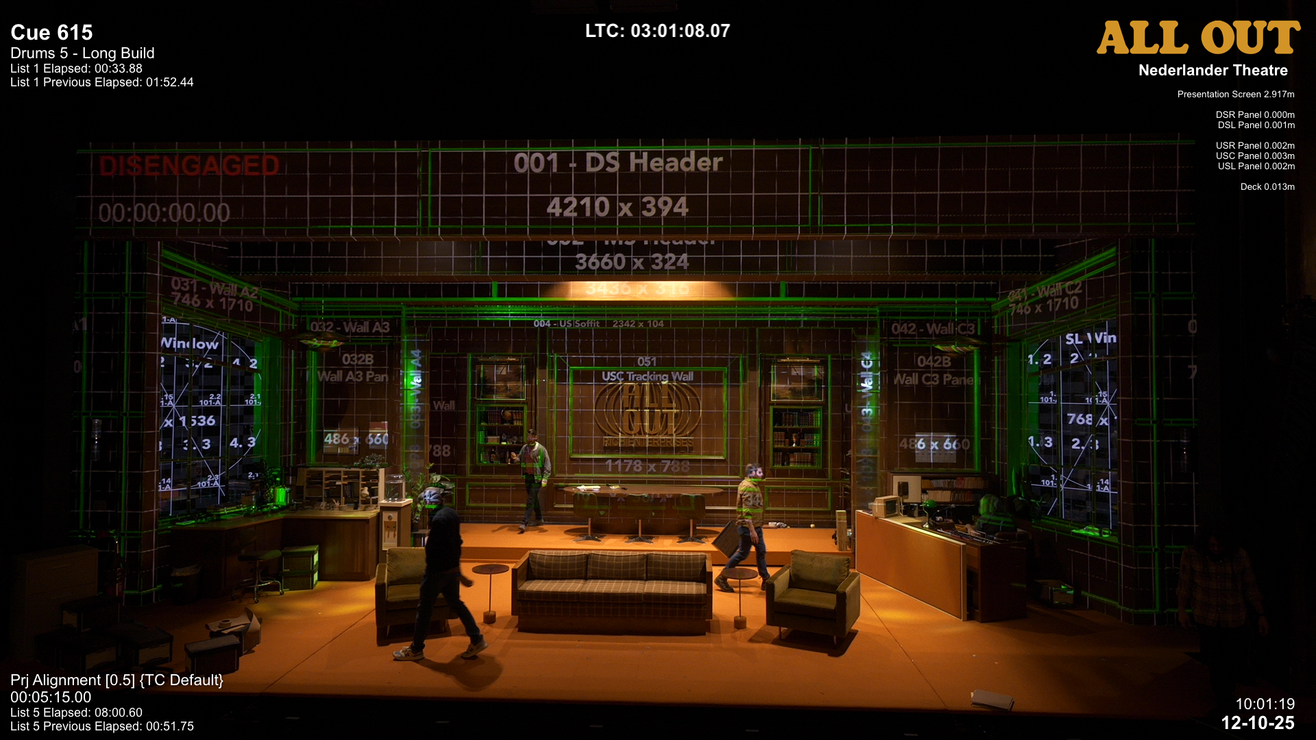 On All Out I received technical drawings from the scenic department and was tasked with creating a simplified 3d model for import into disguise. In addition to the model put together content templates and programmed the show consisting of several timecoded song sequences and slideshow type sequences of still images triggered by lighting nightly. The show consisted of 2 c3One Led walls behind the windows, and Upstage Absen JP-8 transparent led wall, 2 Panasonic RZ34k projectors front of house and 1 Epson L2000u projector onstage.